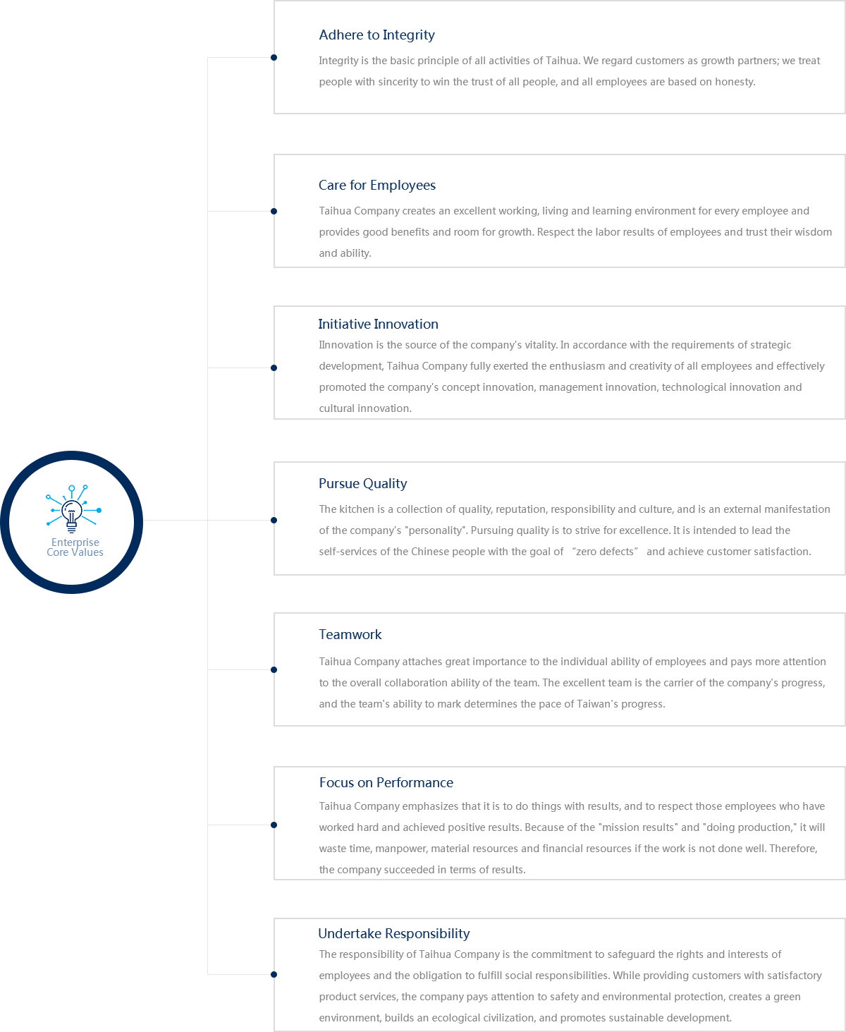 Enterprise Core ValuesAdhere to integrity, care for employees, initiative innovation, pursue quality, teamwork, focus on performance and undertake responsibility.