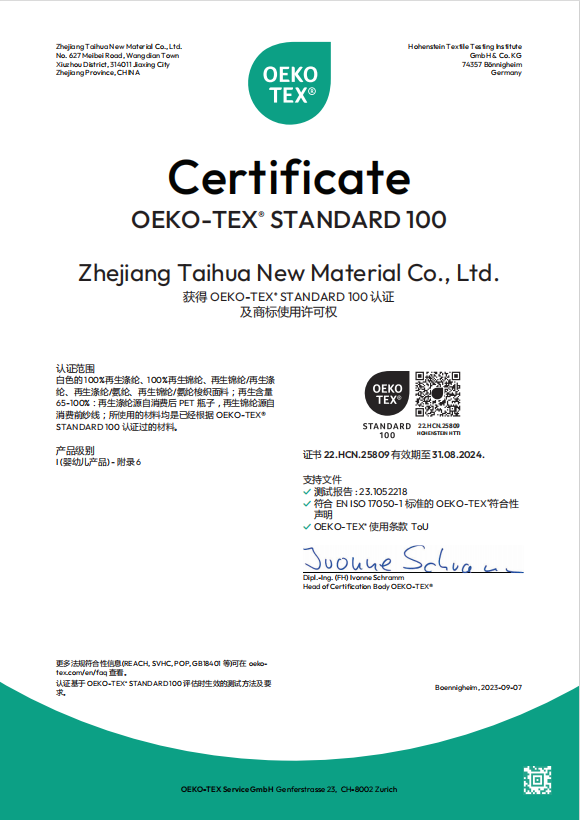 臺(tái)華新材 2023年再生產(chǎn)品Oeko-Tex Standard 100證書(shū)