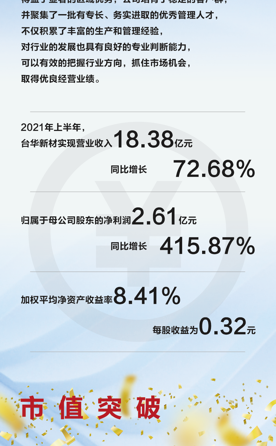 2021年上半年,臺(tái)華新材實(shí)現(xiàn)營(yíng)業(yè)收入18.38億元,同比增長(zhǎng)72.68%。歸屬于母公司股東的凈利潤(rùn)2.61億元,同比增長(zhǎng)415.87%,加權(quán)平均凈資產(chǎn)收益率8.41%,每股收益為0.32元。市值突破100億元!
