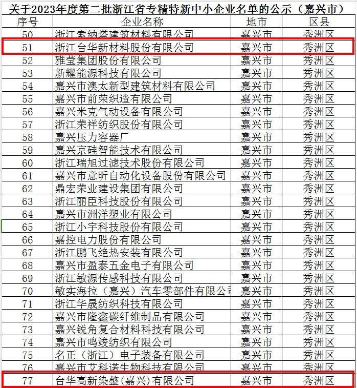 近日,嘉興市經(jīng)濟(jì)和信息化局發(fā)布了《關(guān)于2023年度第二批浙江省專精特新中小企業(yè)名單的公示(嘉興市)》,浙江臺華新材料股份有限公司和臺華高新染整(嘉興)有限公司上榜。