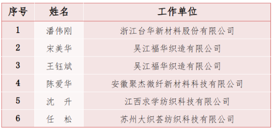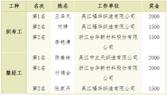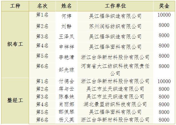 (1)織布和整經(jīng)第1-6名授予“全國紡織行業(yè)技術(shù)能手”榮譽稱號,具體名單如下: