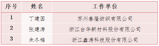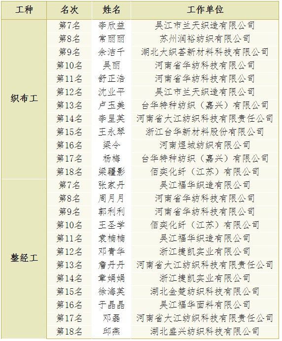 (2)織布和整經(jīng)第7-18名授予“全國長絲織造行業(yè)技術(shù)能手”榮譽稱號,具體名單如下: